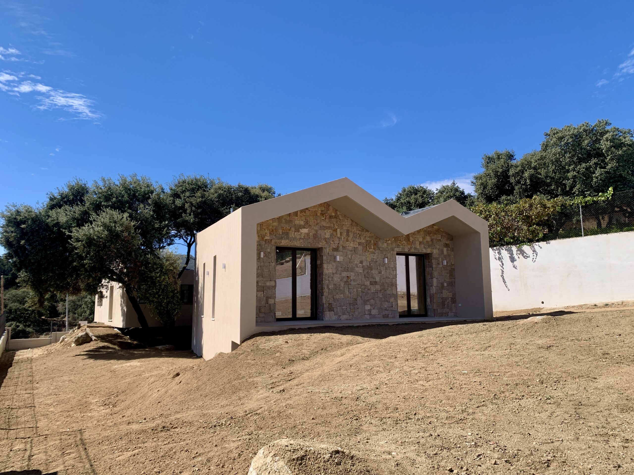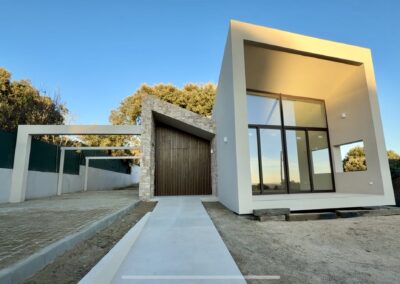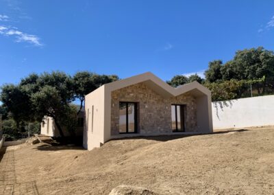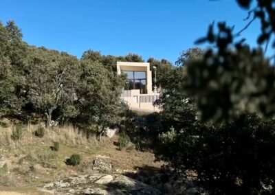 La parcela tiene dos condicionantes muy potentes. Interiormente, está dividida en dos partes por dos grandes encinas que van a ser respetadas por la vivienda. Exteriormente, está situada a los pies del Parque Nacional de la Sierra de Guadarrama, siendo este un entorno natural de gran valor y belleza con vistas y conexión directa al encinar y al embalse del Valmayor.