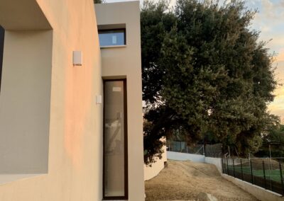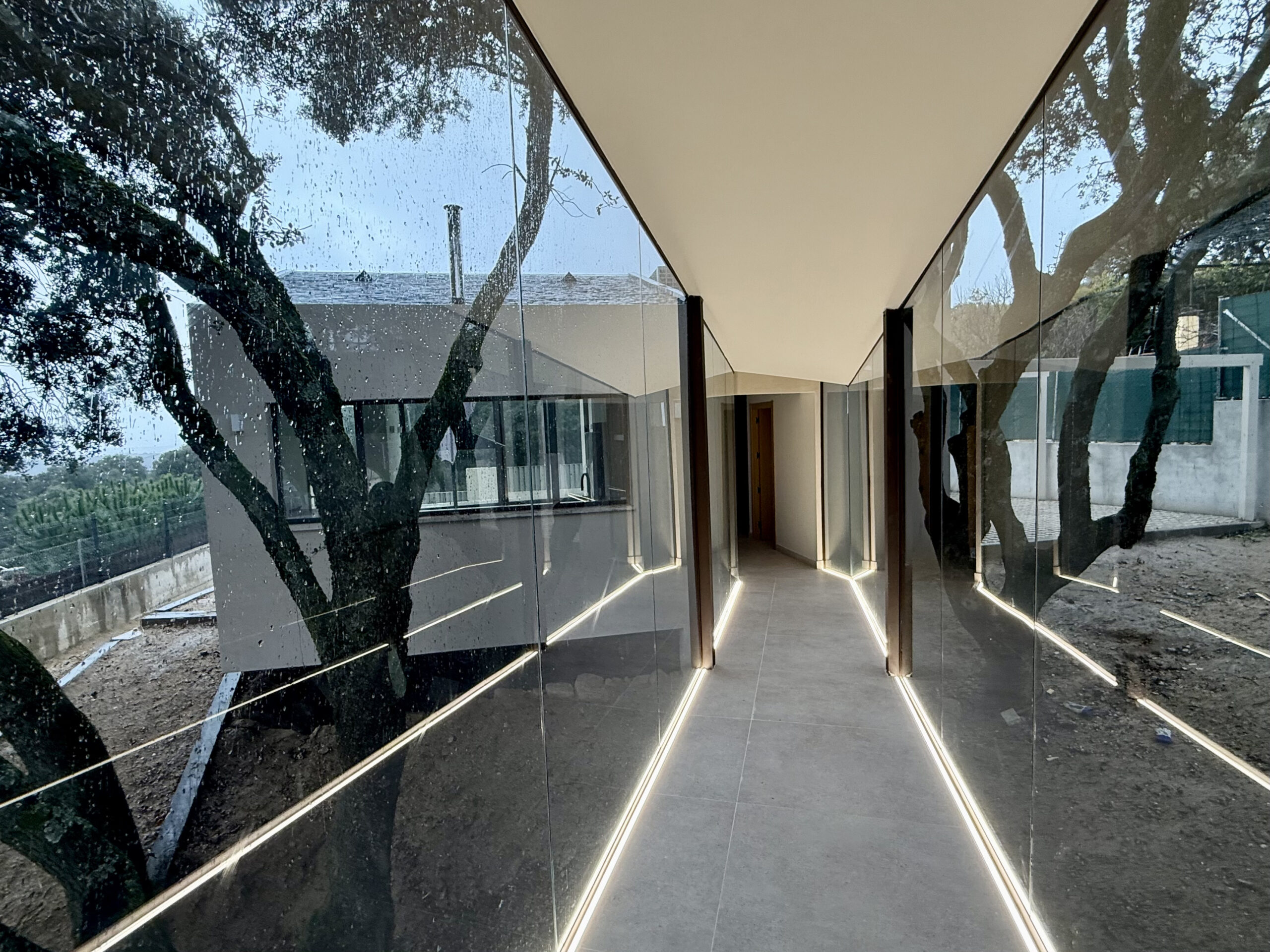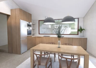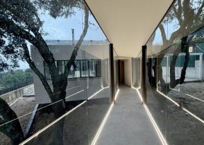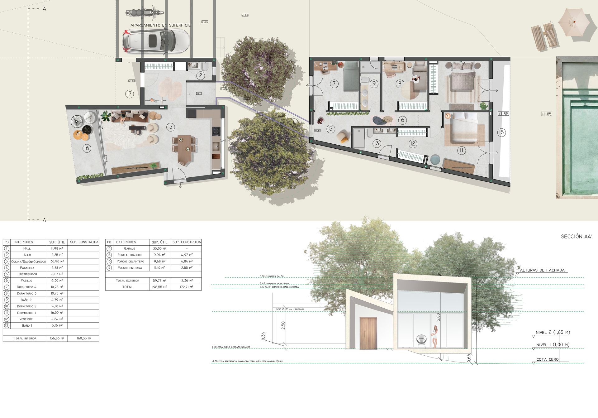 Se proyectan por tanto a ambos lados de la vegetación dos grandes volúmenes conectados por una pasarela de vidrio que cruza bajo el arbolado. El primer bloque está compuesto por acceso, garaje, aseo, cocina, comedor y salón. El segundo bloque contiene la parte más privada, es decir, los dormitorios y baños así como un porche con salida directa al jardín posterior.
