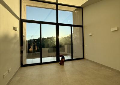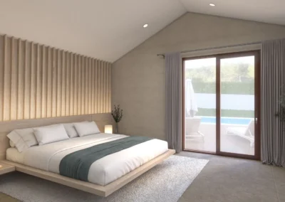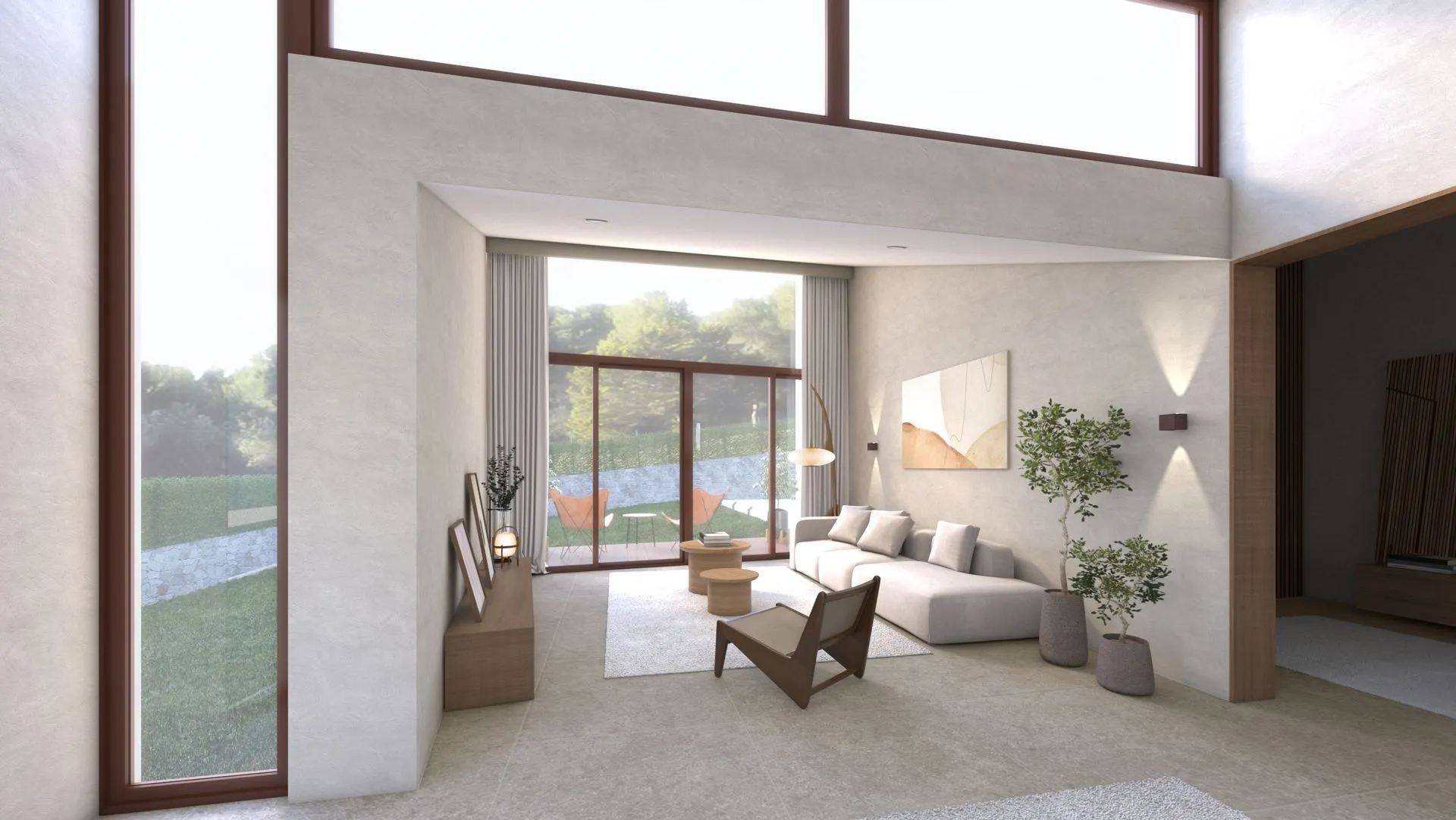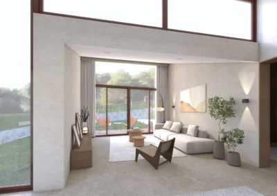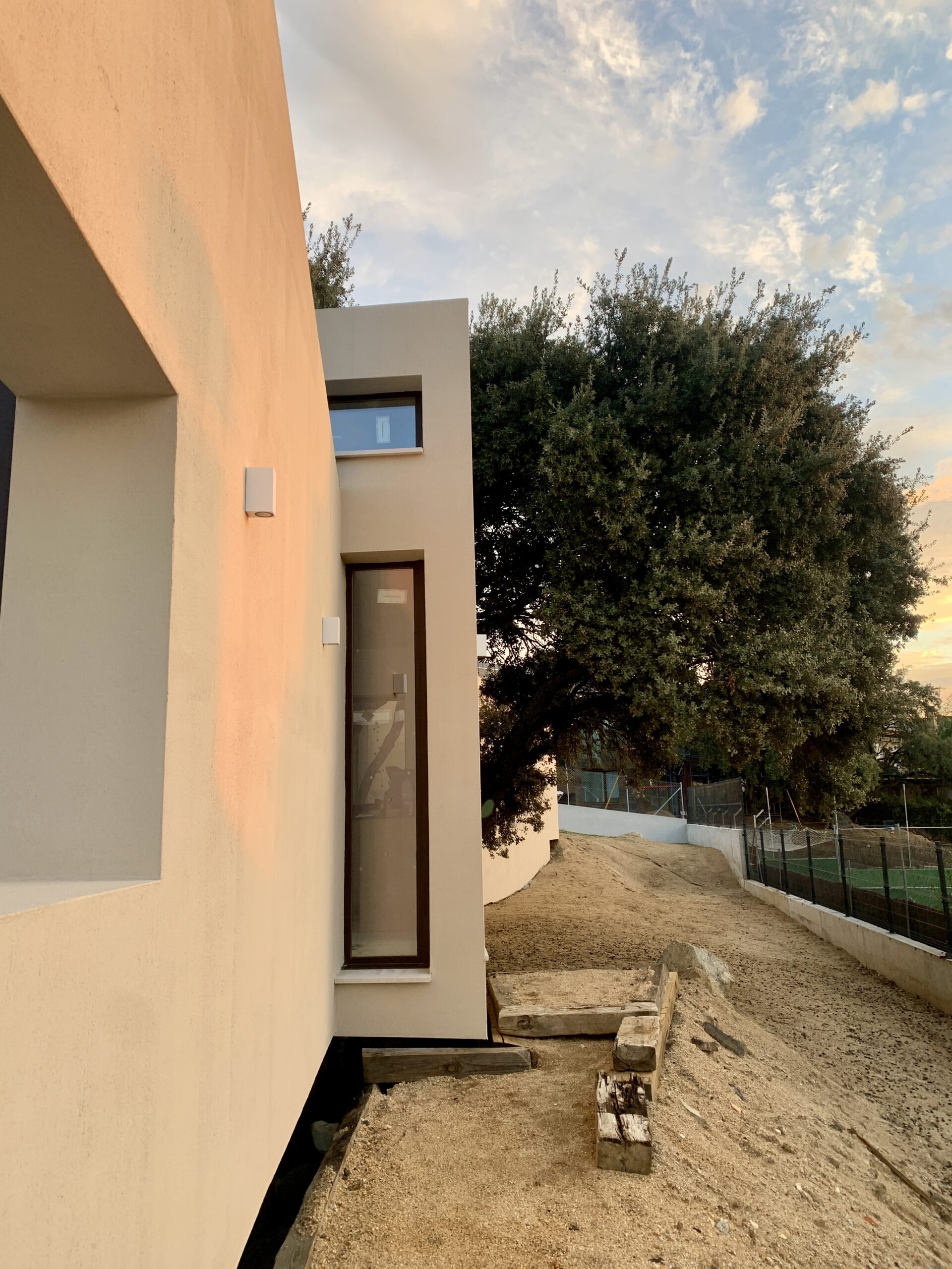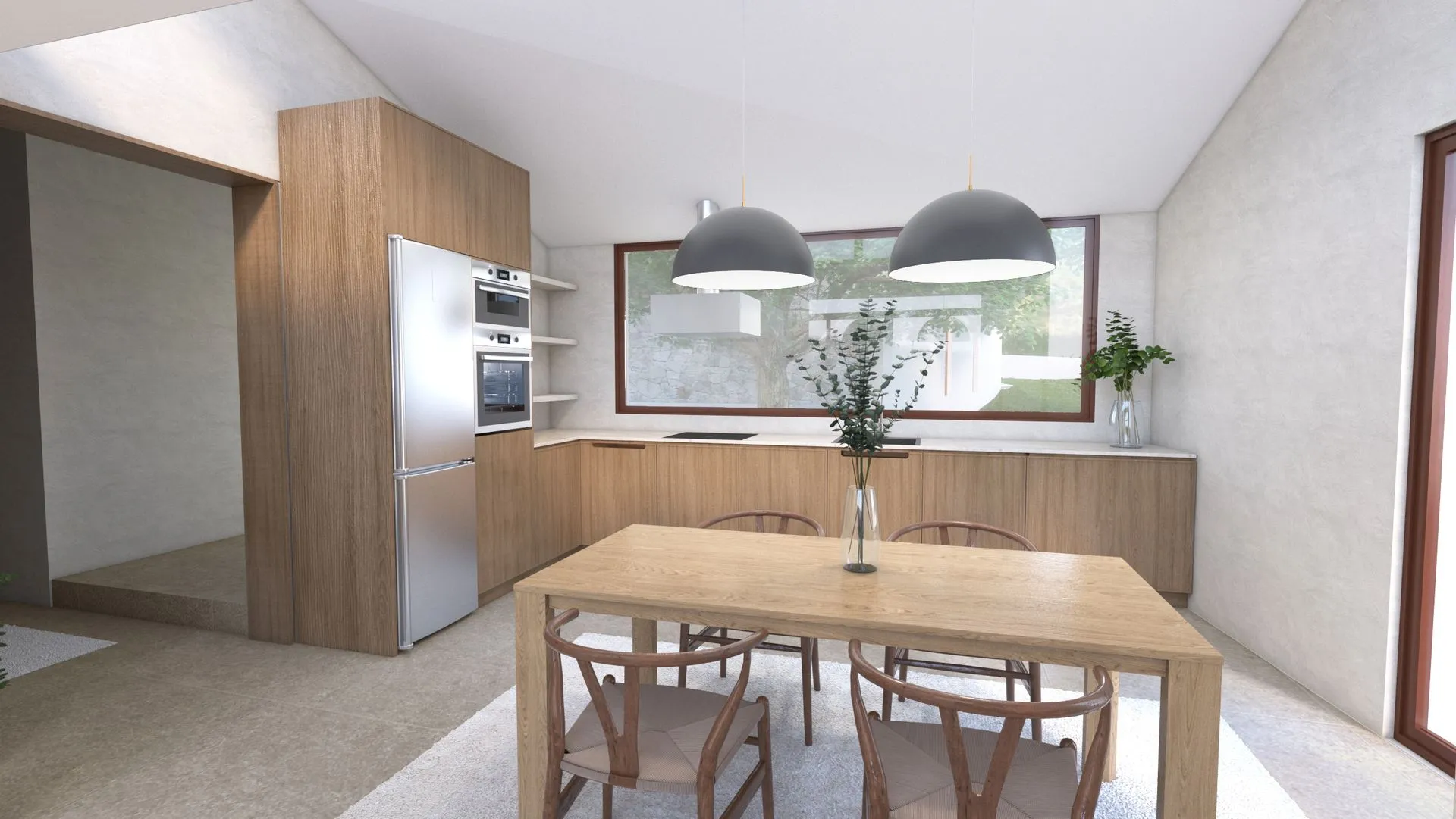 Se proyectan por tanto a ambos lados de la vegetación dos grandes volúmenes conectados por una pasarela de vidrio que cruza bajo el arbolado. El primer bloque está compuesto por acceso, garaje, aseo, cocina, comedor y salón. El segundo bloque contiene la parte más privada, es decir, los dormitorios y baños así como un porche con salida directa al jardín posterior.